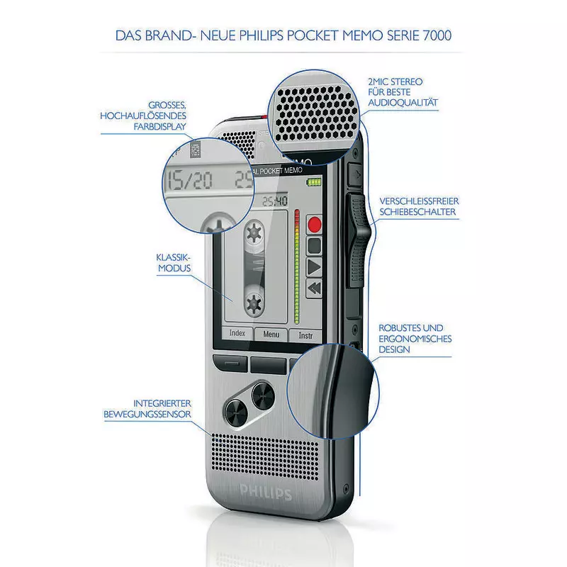 - Hohe Aufnahmequalität in den Formaten DSS und MP3