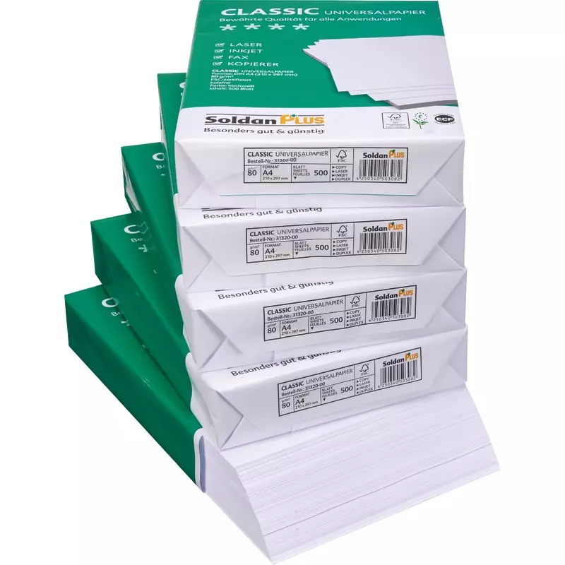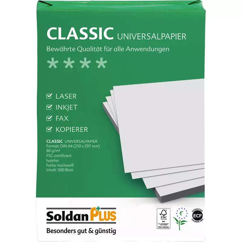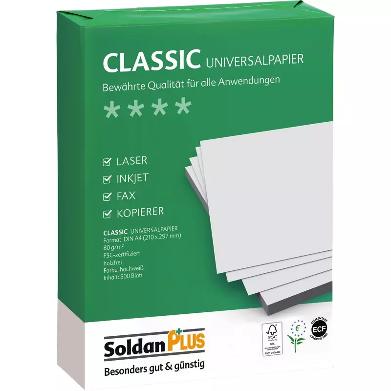 Universell einsetzbar und somit sehr gut geeignet für die unterschiedlichsten Verwendungszwecke im Büro. Zum Kopieren, Drucken, Faxen oder einfach zum Beschreiben. In TOP-Qualität mit hohem Weißegrad und ausgezeichneten Laufeigenschaften zum besonders günstigen Preis. Mit SoldanPlus CLASSIC zeigen Sie sich nicht nur von der besten Seite, sondern schonen auch die Umwelt.